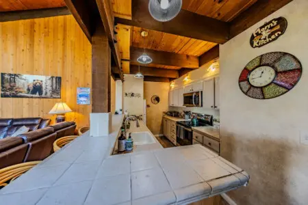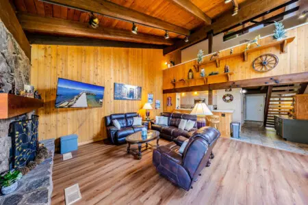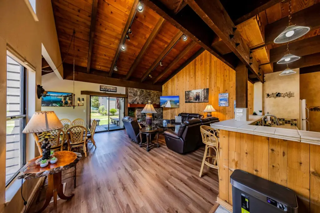 - This cozy living area exudes rustic charm with its warm wooden panel walls, vaulted ceilings, and sliding glass doors leading to a Lakefront outdoor space.
