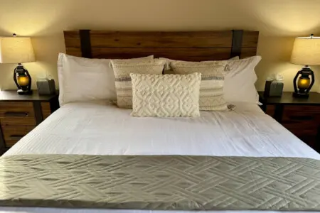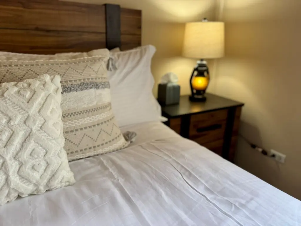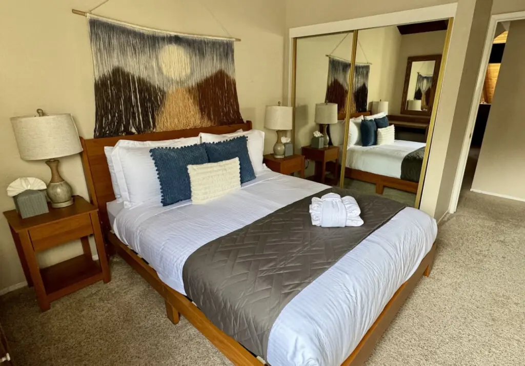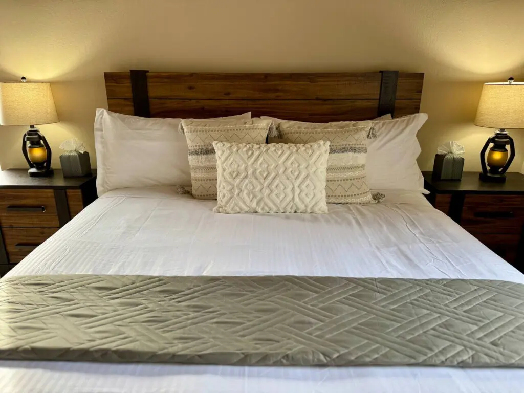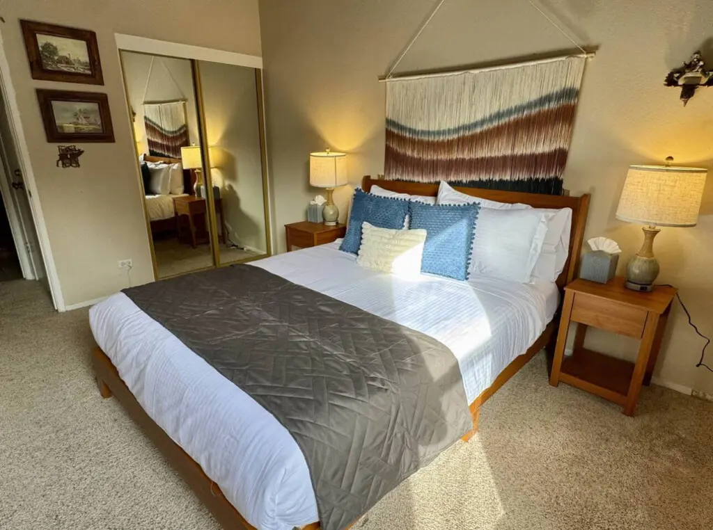 - Queen-size bed with bedside tables and lamps for a cozy feel.