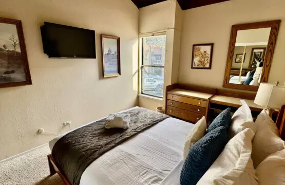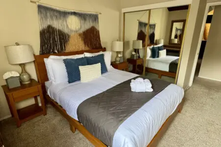 - A large mirrored closet adds functionality and a sense of spaciousness to the room