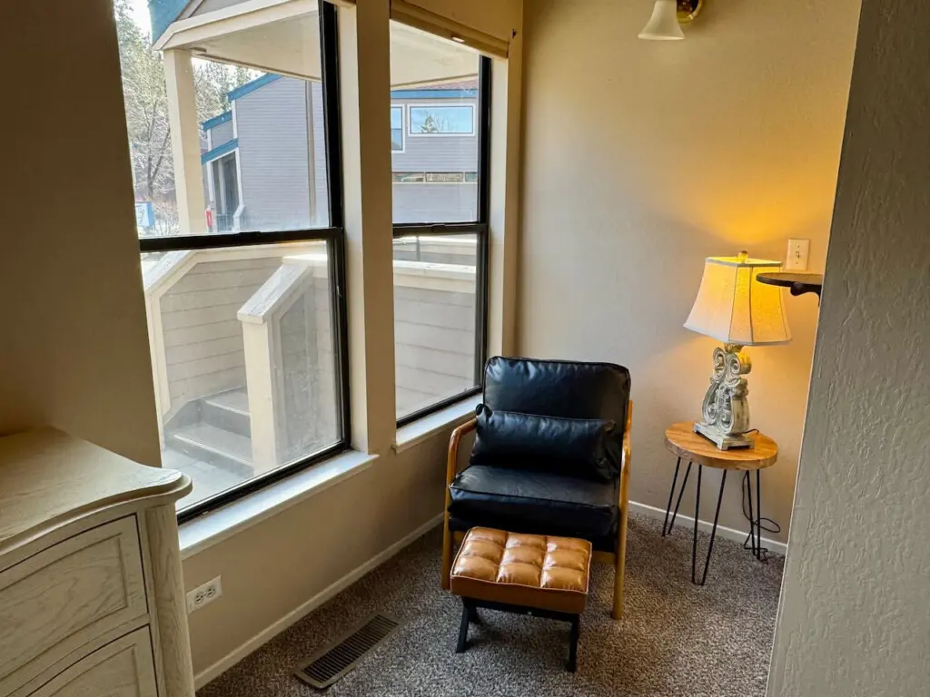 - A reading nook & workspace near the window featuring a cozy chair with a footrest, providing a comfortable spot to read, work, or relax while enjoying natural light.