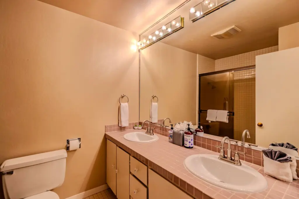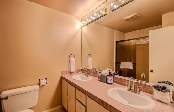 - Double-sink vanity with plenty of counter space—great for couples or families.