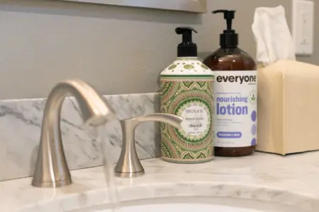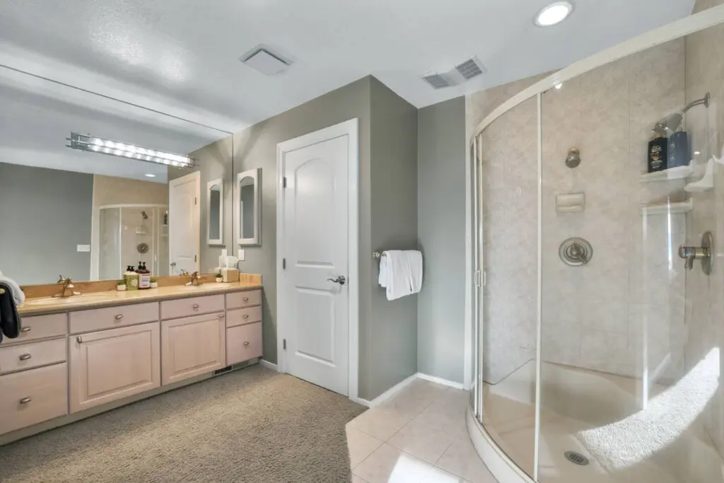 * En-suite bathroom featuring modern fixtures and twin sinks.