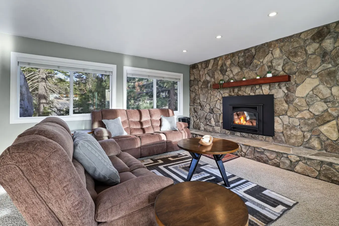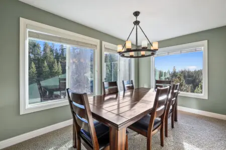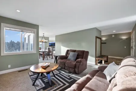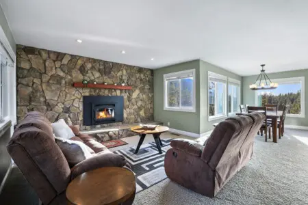 * 2 spacious living rooms - One with a lake view connected to the kitchen and one with a fireplace and mountain views.
