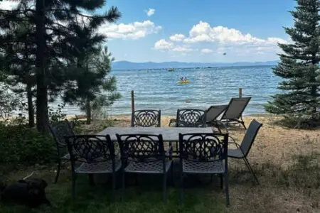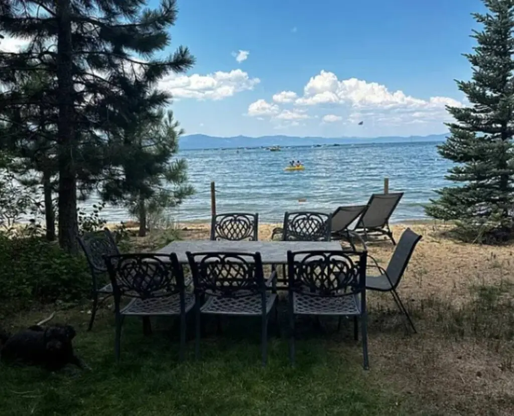 - True Tahoe lakefront living: private sandy beach area with Adirondack chairs reserved for this property.
