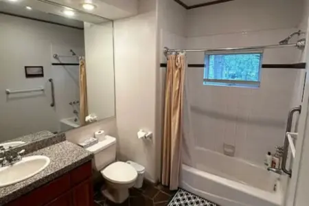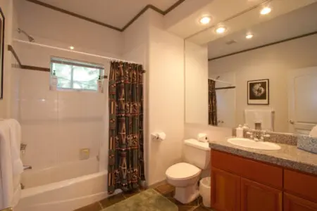 - Tub/shower combo, single-basin vanity—convenient for families.