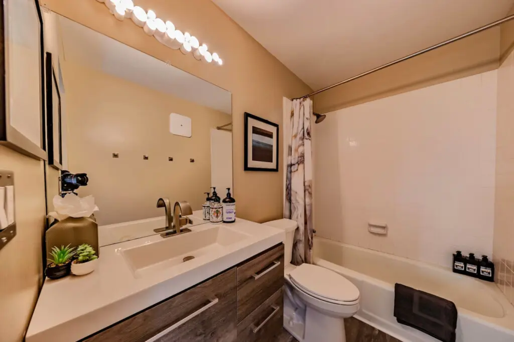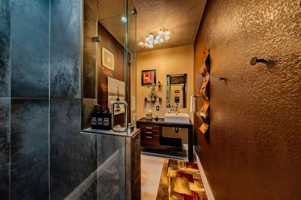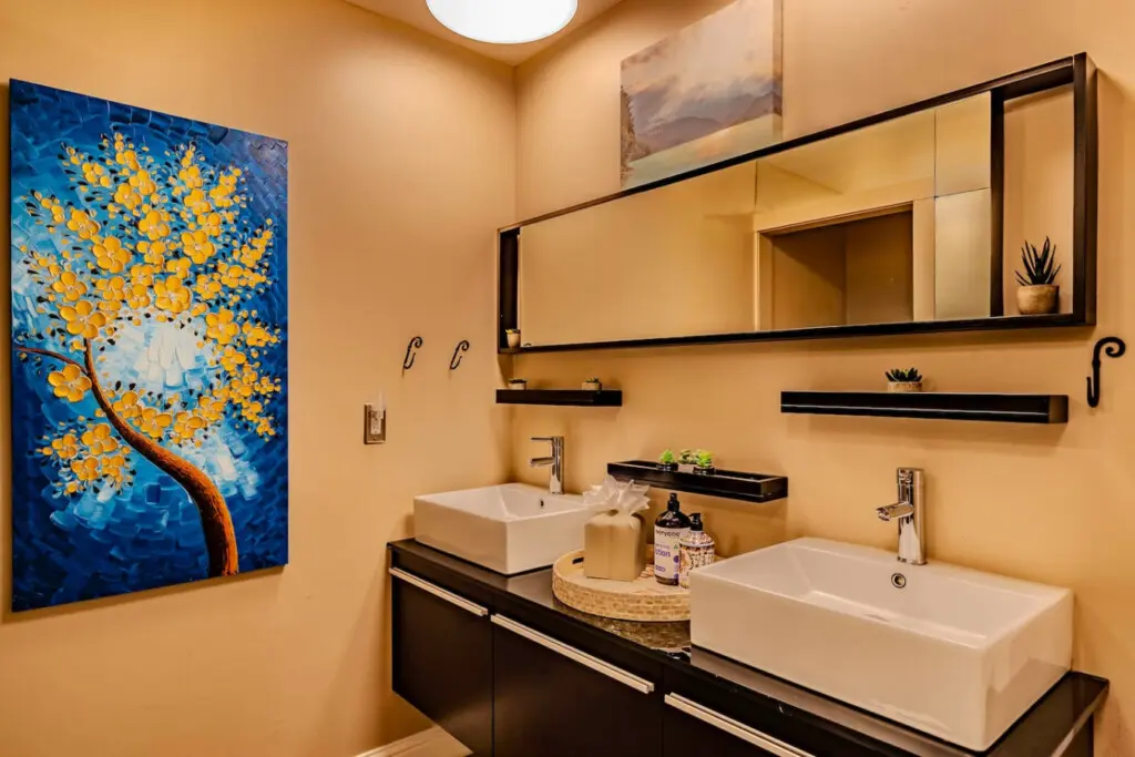- Beautifully renovated vanity with twin sinks, oversized mirrors, and stylish lighting