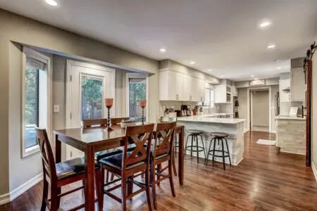 – Indoor Dining table for 8 people and 3 pub chairs at kitchen bar