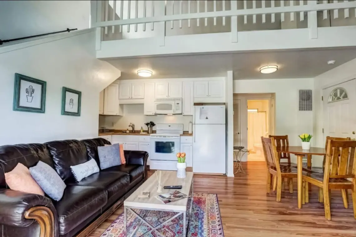 Our Pet Friendly 2BR Loft Townhome is furnished with care and located near hiking/biking trails & Heavenly’s Stagecoach lift! We offer high speed Wi-Fi, a fully equipped kitchen, full bath, 1 Queen & 2 Twin beds w/ Luxury White Bedding, a wood burning fireplace, free parking, and fully stocked supplies. There is also a large balcony with pub table, Adirondack chairs, and it has a gorgeous mountain view! Your perfect home base to stay and play in Tahoe! VHRP20-1015