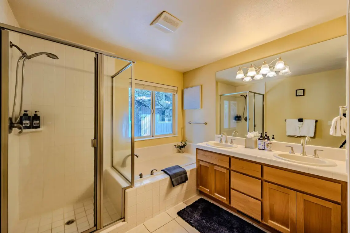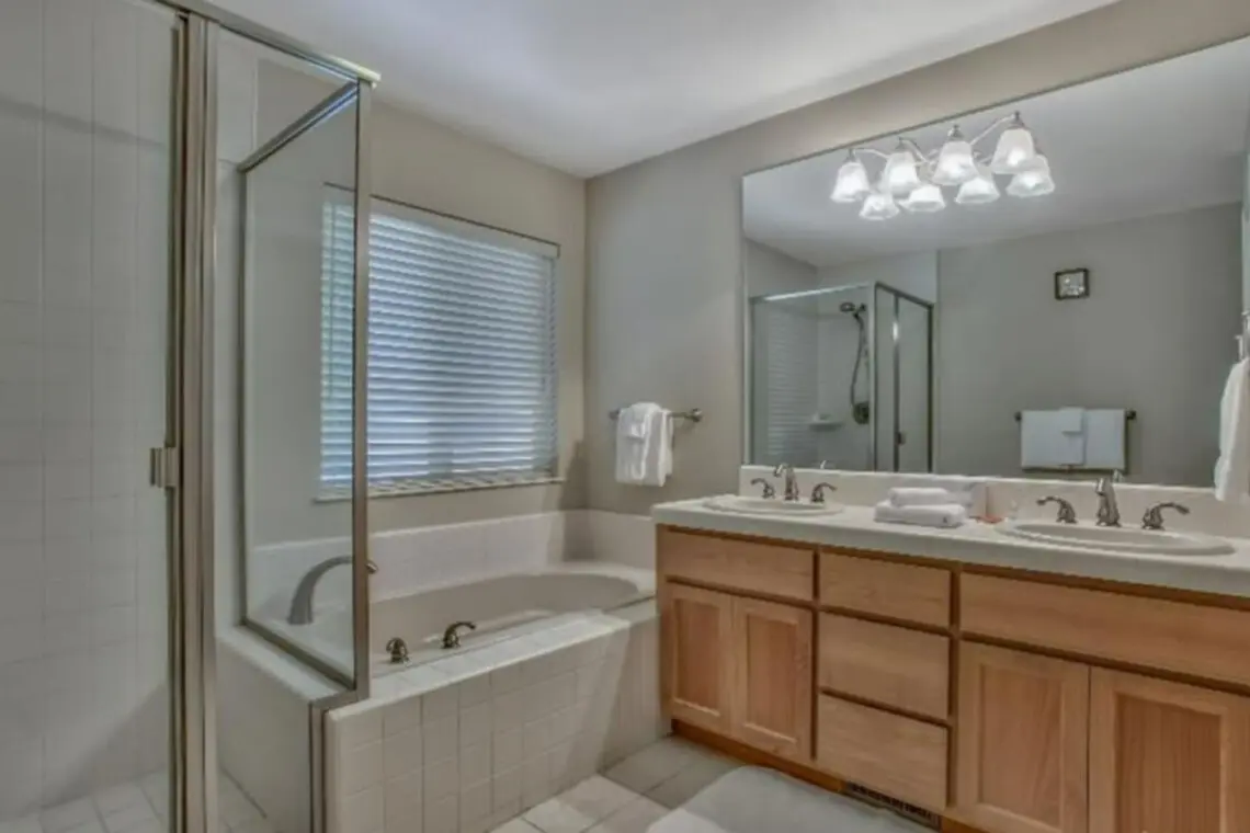 – Soaker tub, dual sinks, and a private toilet room—great for couples or getting ready with ease.