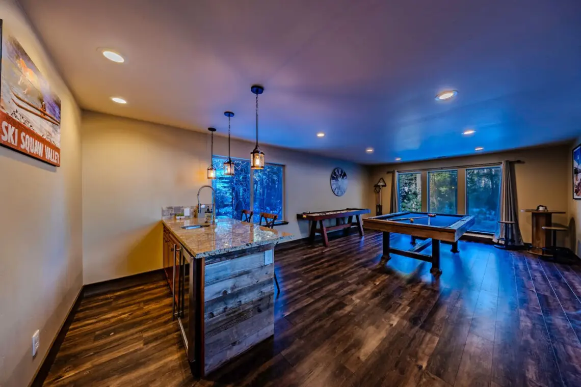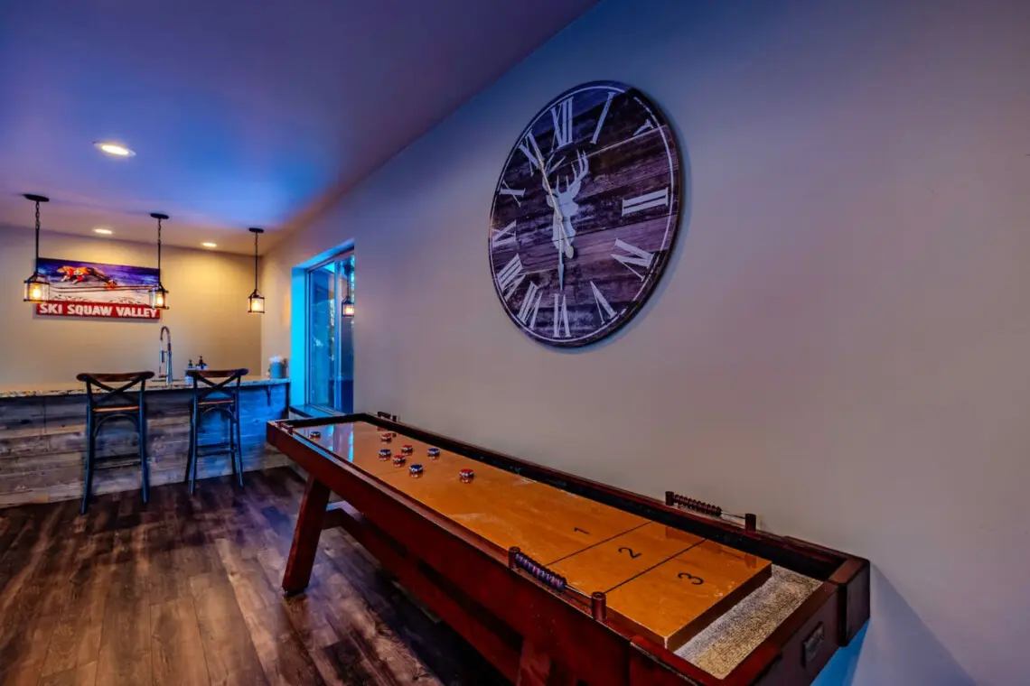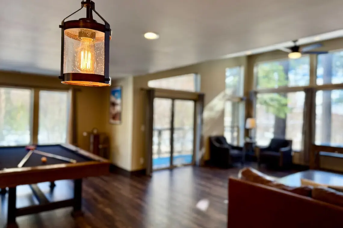 – Full game setup with 8’ pool table and shuffleboard table—perfect for après-ski hangouts and family tournaments.