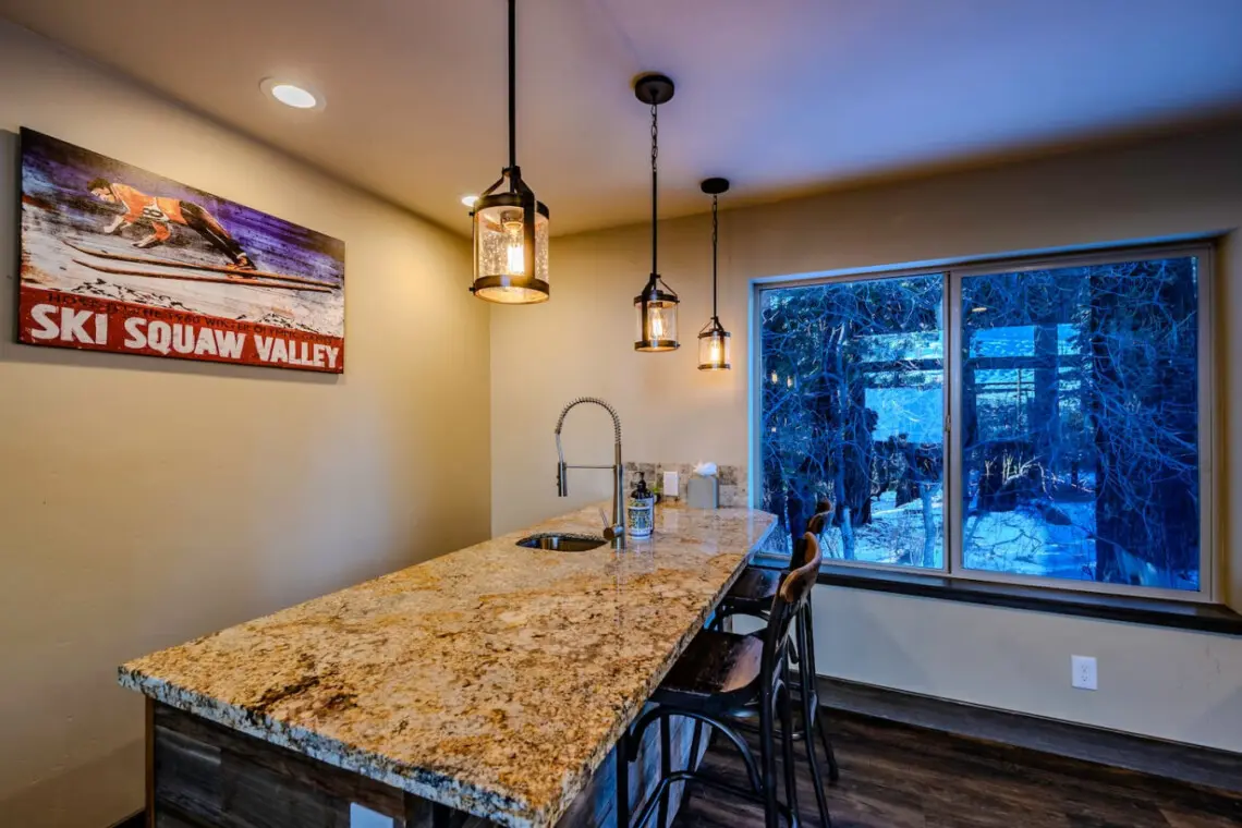 – Wet bar with sink, wine fridge, and bar seating (3 stools) so you can pour a glass of wine or mix cocktails without leaving the fun.