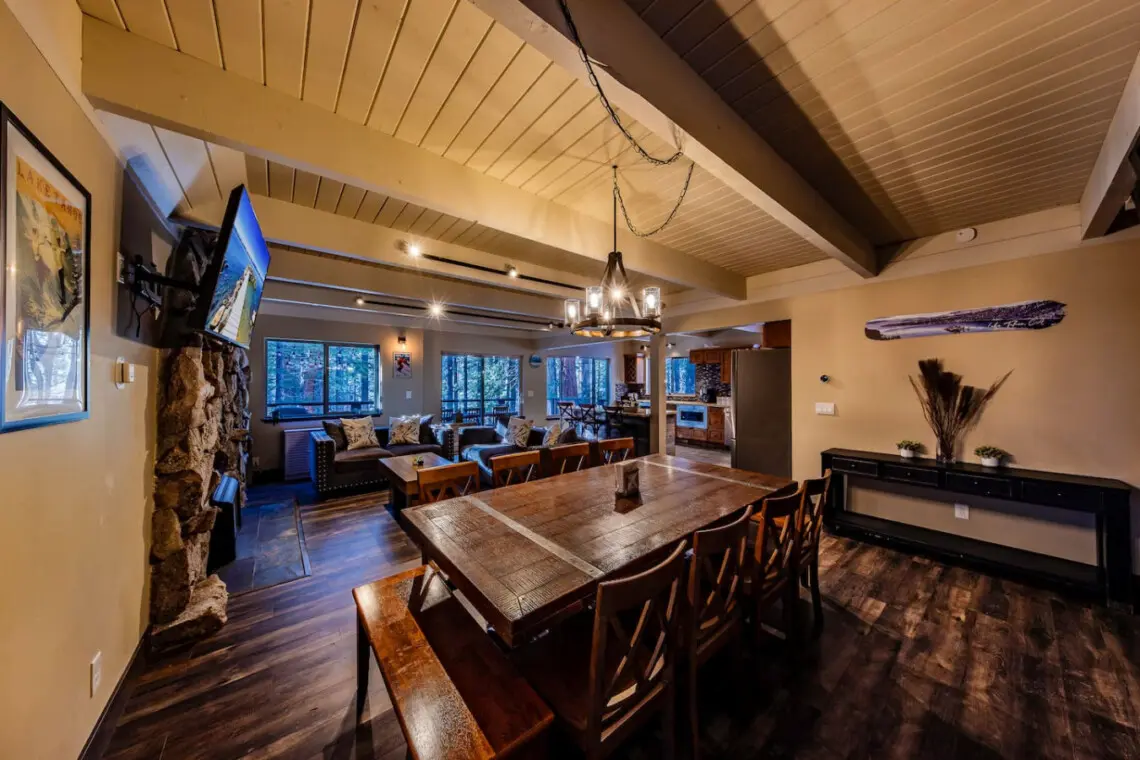 Walk to Heavenly’s California Base, then come home to a true Tahoe lodge—two big living areas, a game lounge with pool/shuffleboard + wet bar, and decks with slopeside views. Cook like a pro in the Wolf-equipped chef’s kitchen, then unwind in the 8-person hot tub or indoor sauna. Rainfall showers and a king primary suite add a spa-level reset. Perfect for families and friend groups up to 12 who want ski days and cozy nights. Fast Wi-Fi, easy parking, and beds made for deep sleep.