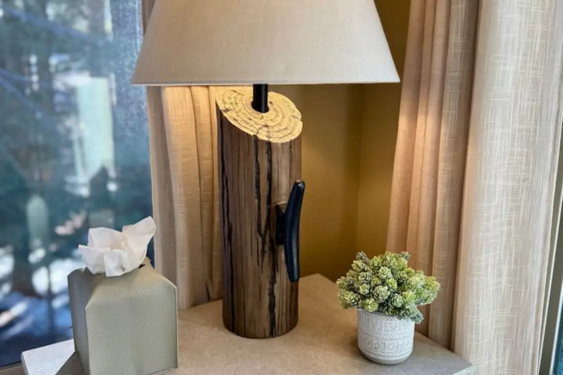 – Industrial-style chandelier adds a modern, mountain-chic touch.
