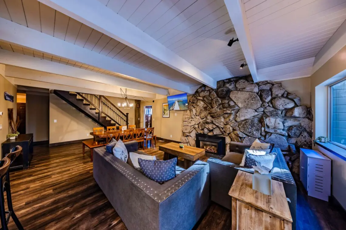 – Nail-head design sofa set centered around a natural granite rock fireplace—classic Tahoe lodge ambiance.