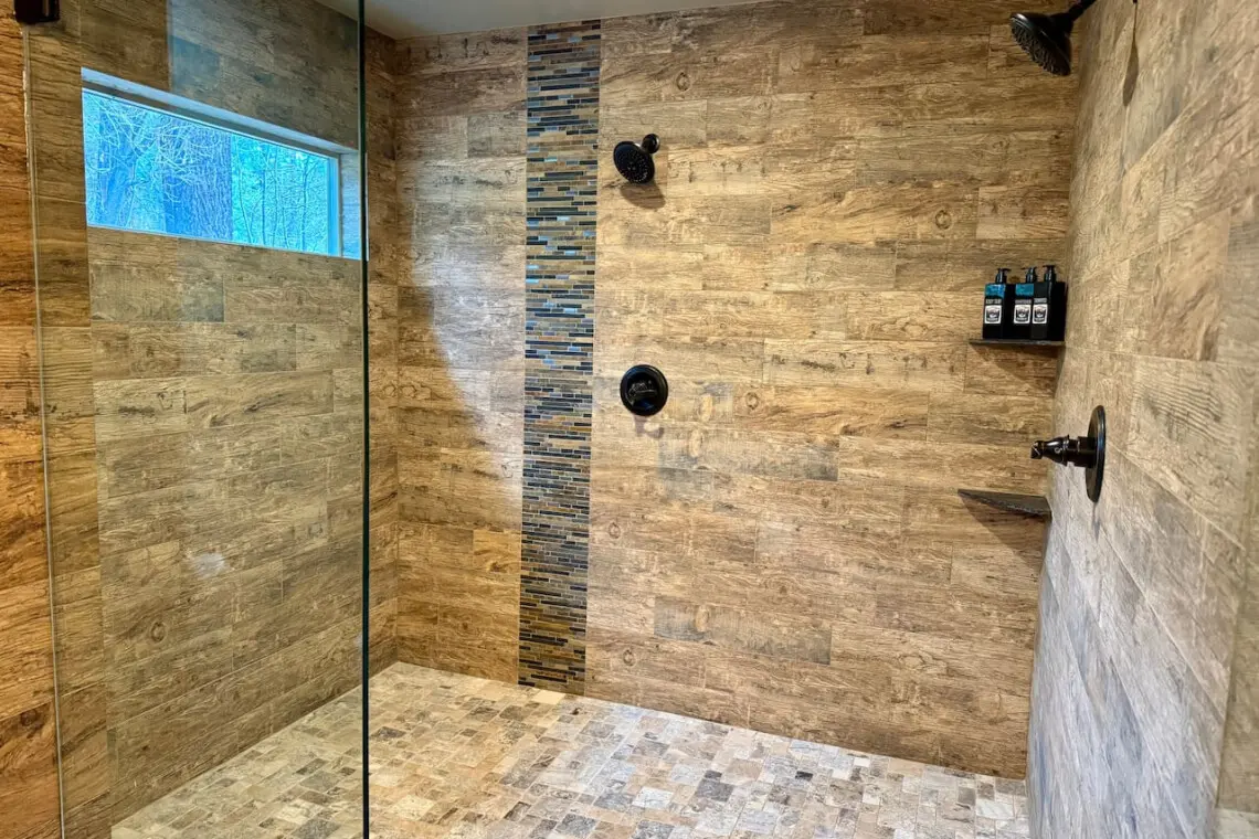 – Huge shower room with two separate showers and wood-look tile—feels like showering in a forest spa.