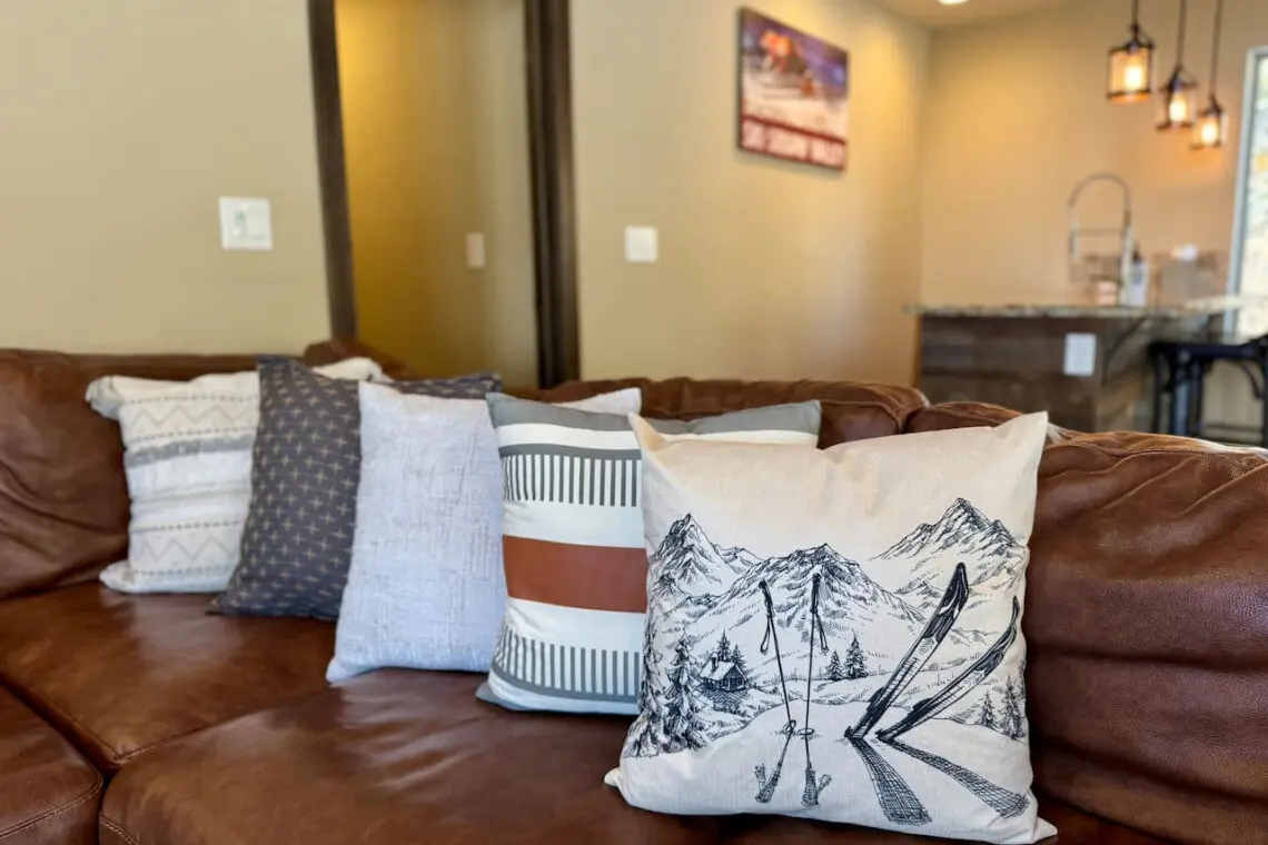 – Large real-leather sectional easily seats 8–10 guests, plus two stylish pub chairs with nail-head trim.