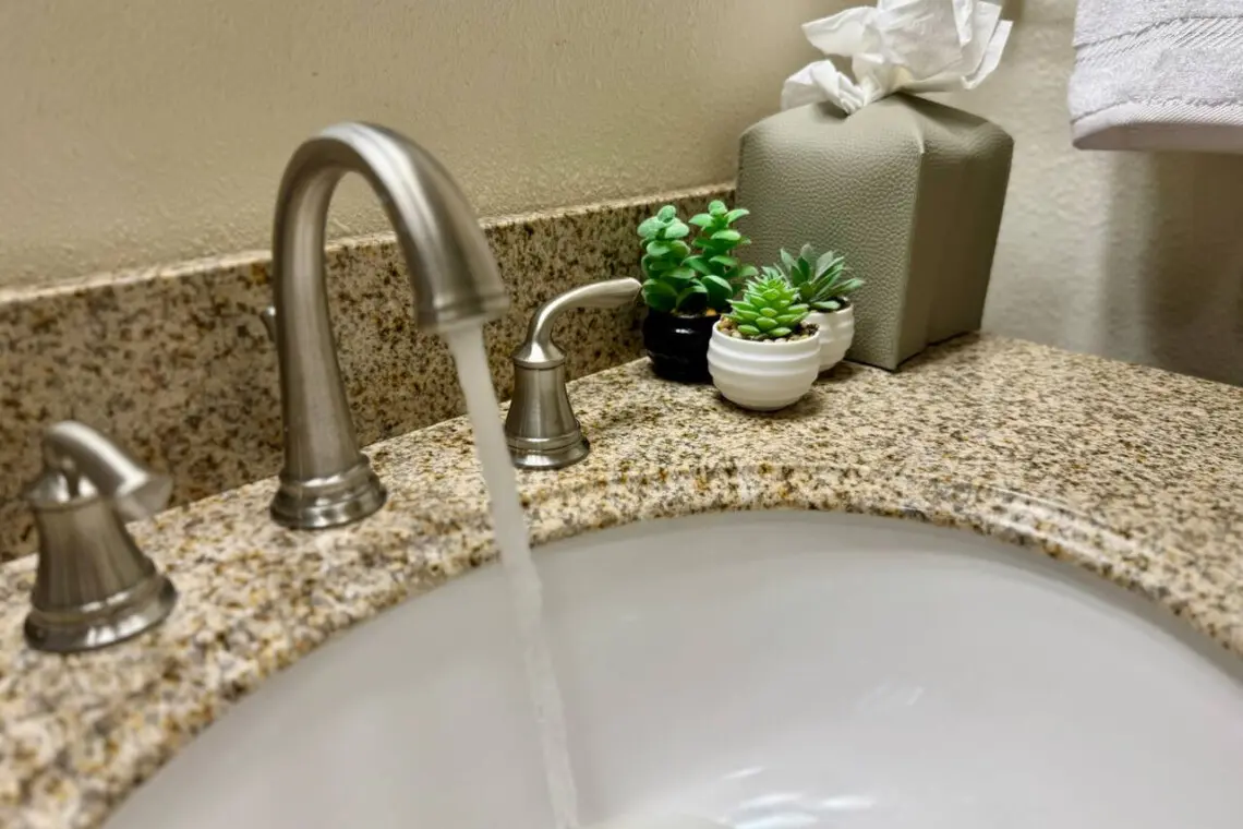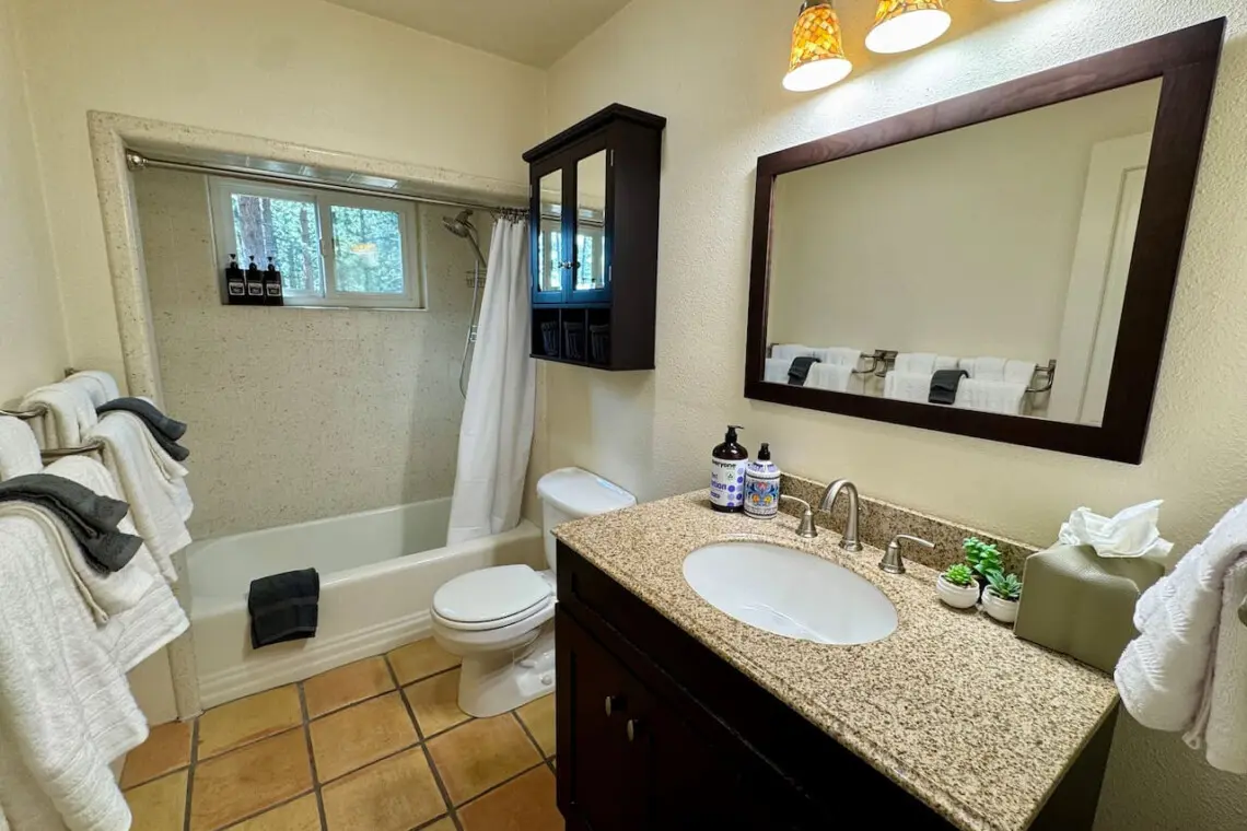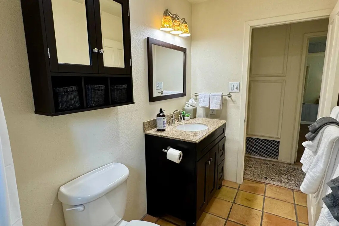 – Includes single sink vanity, toilet, and a shower/tub combo, plus cabinetry for toiletries and essentials.