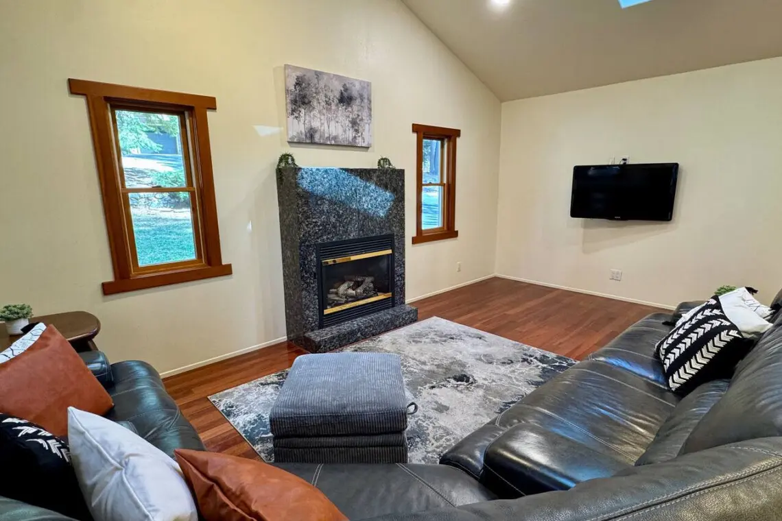 – Cozy living room w/ gas fireplace + wall-mounted TV