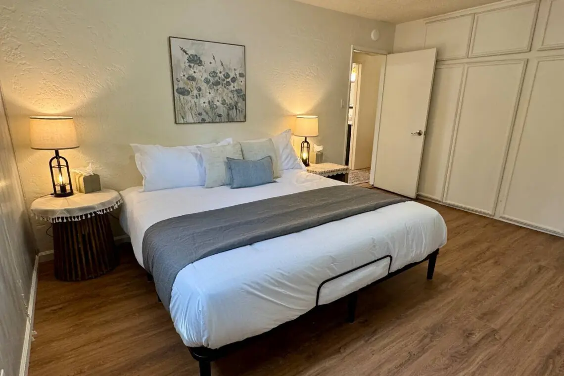 – King bed with two nightstands, charging station, and guest closet—simple, comfortable, and uncluttered.