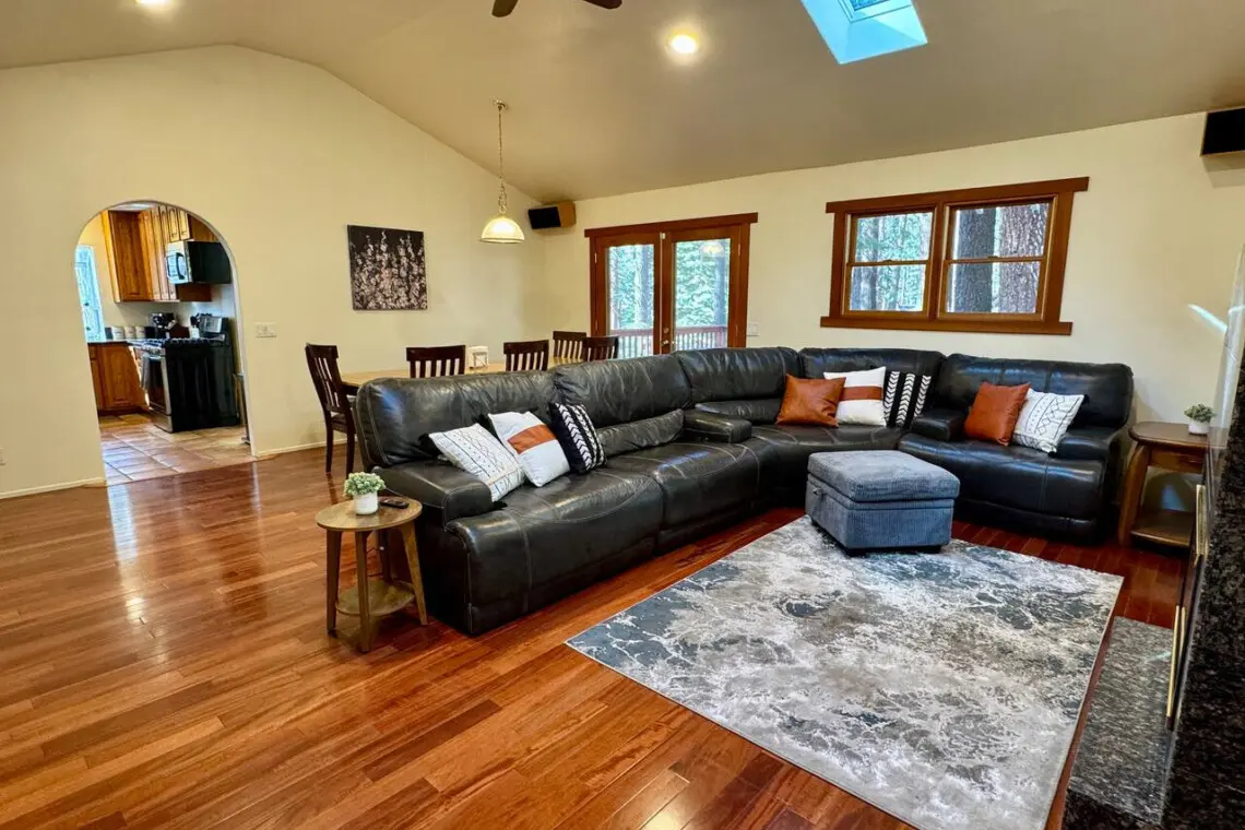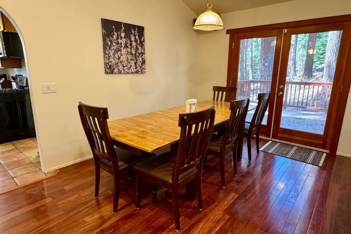 – Open-concept living/dining setup designed for easy gathering after a day at Lake Tahoe.