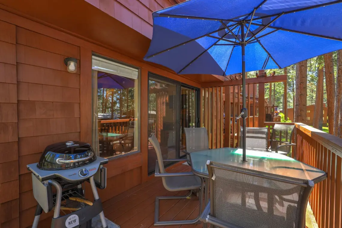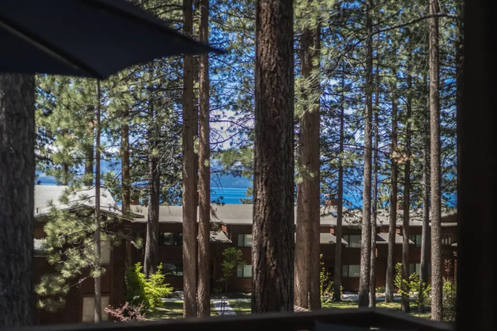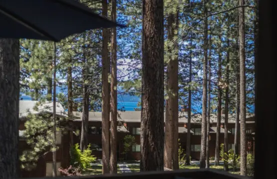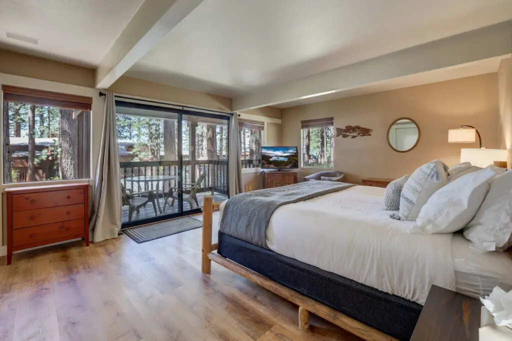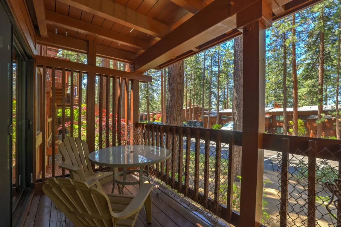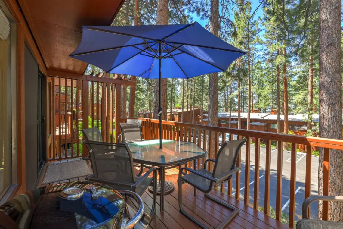 – Sliding glass doors lead to a furnished balcony with filtered views of Lake Tahoe.