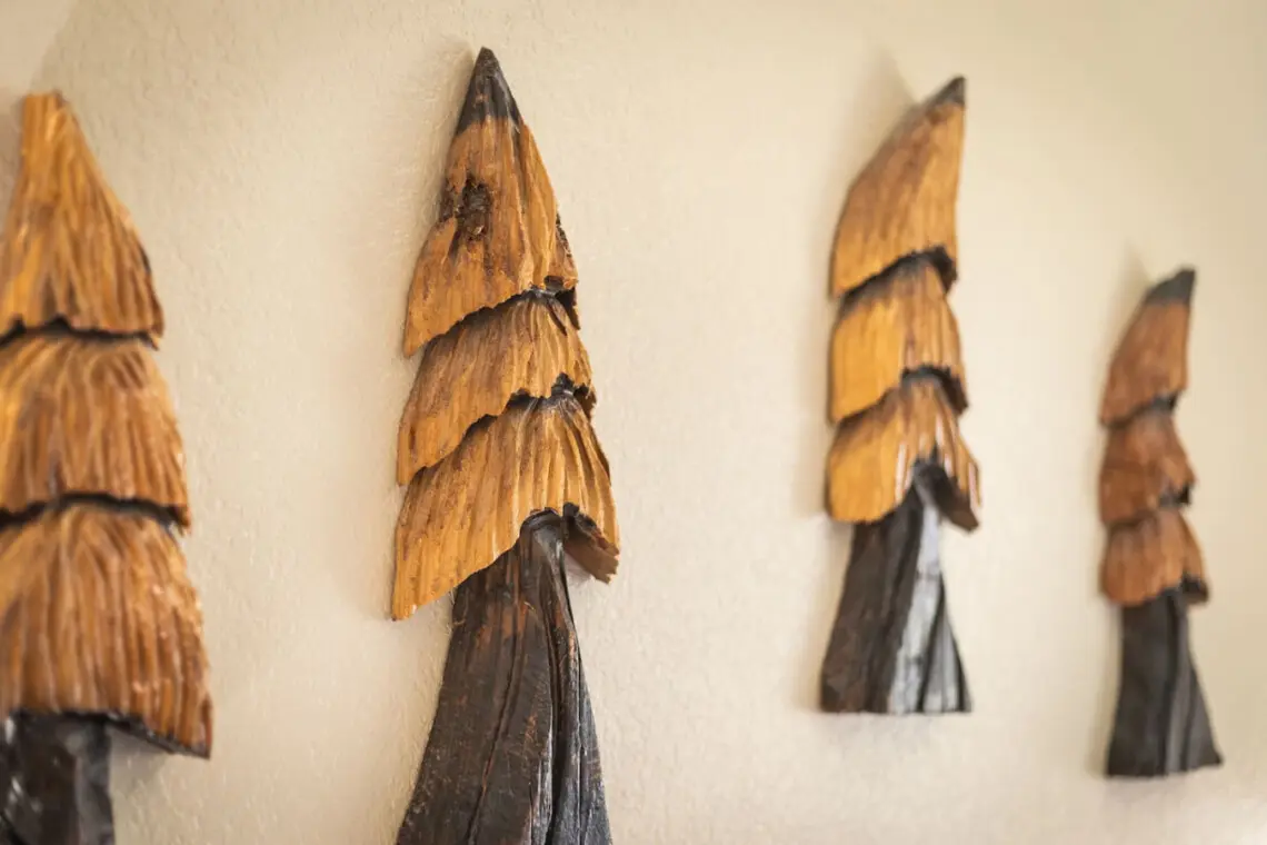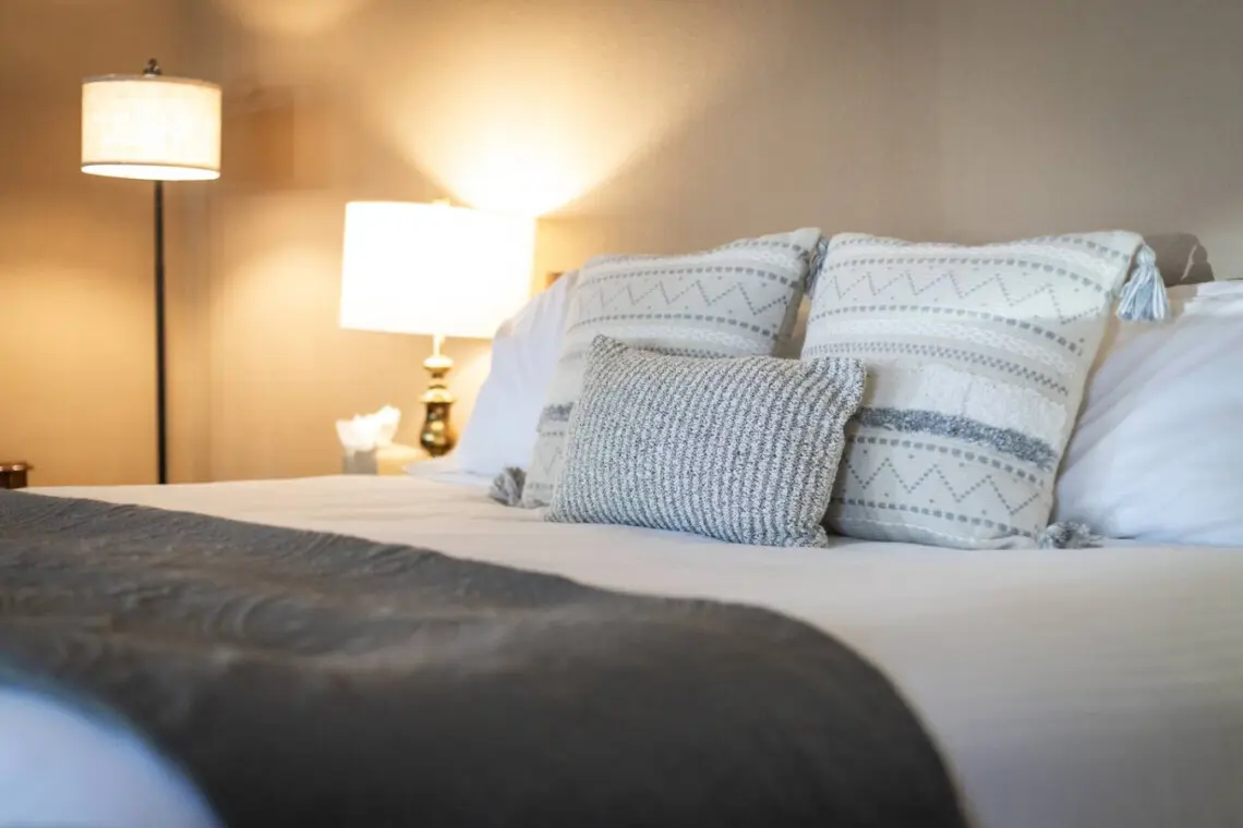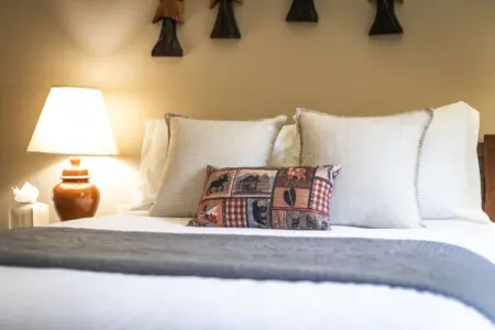 – Queen-size bed with cozy linens, warm lighting, and a large window with forest views.