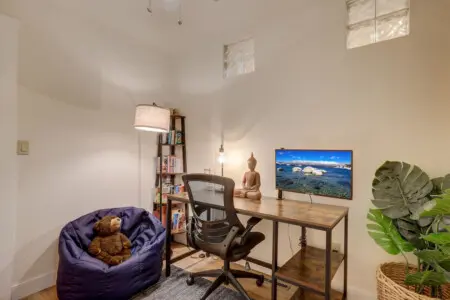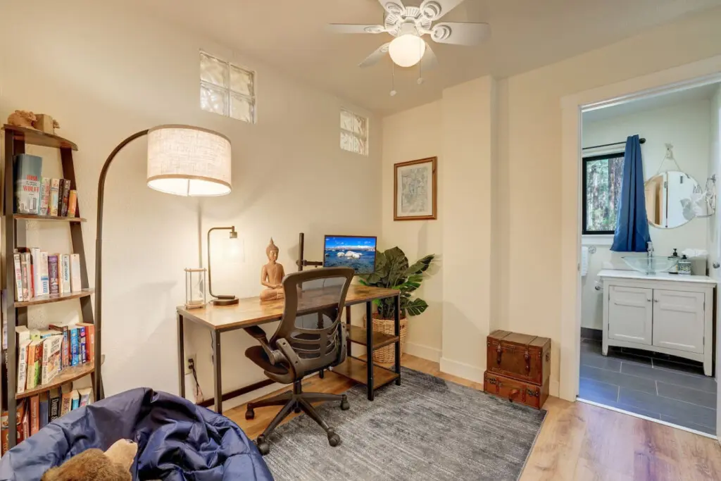 – Has a second door that opens to the office to accommodate flexible guest needs.