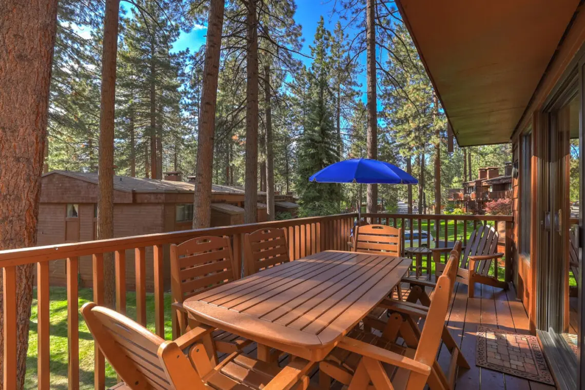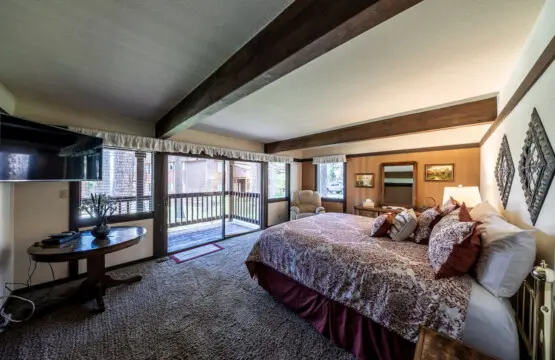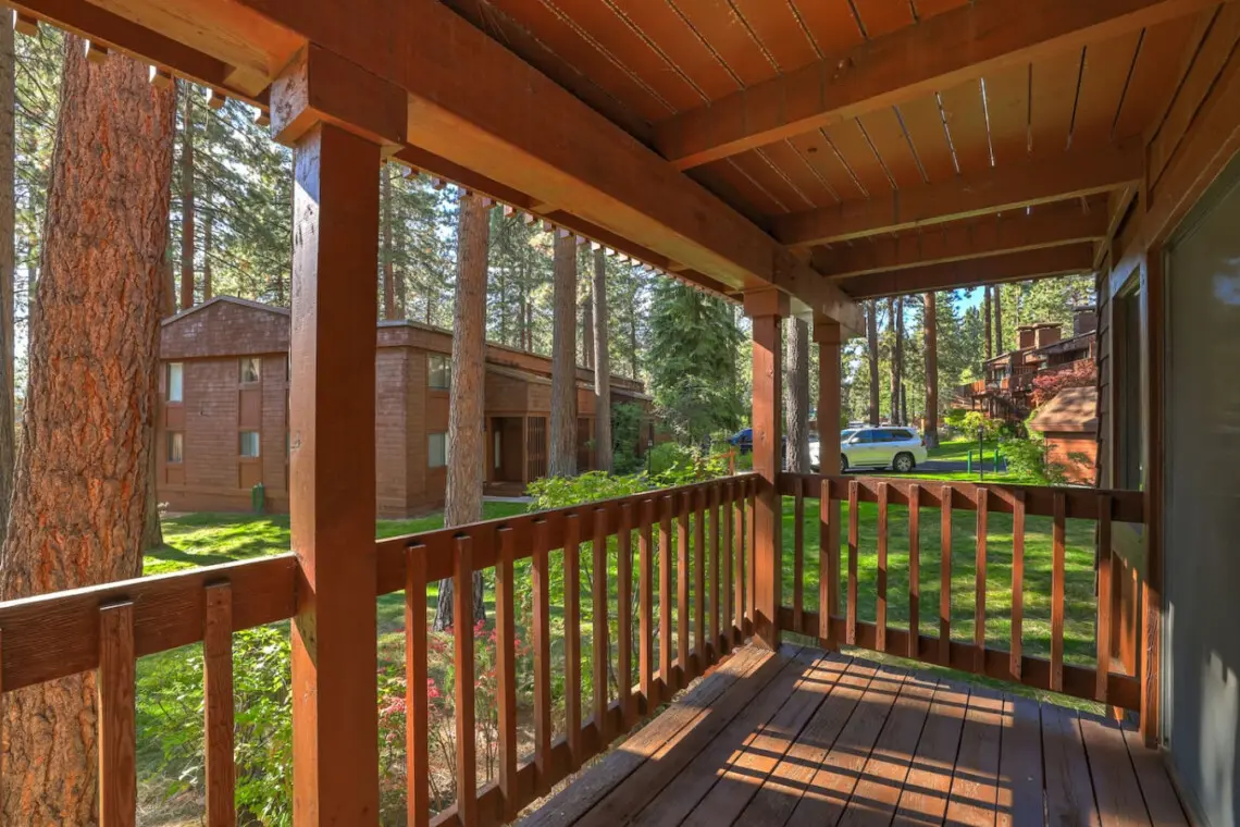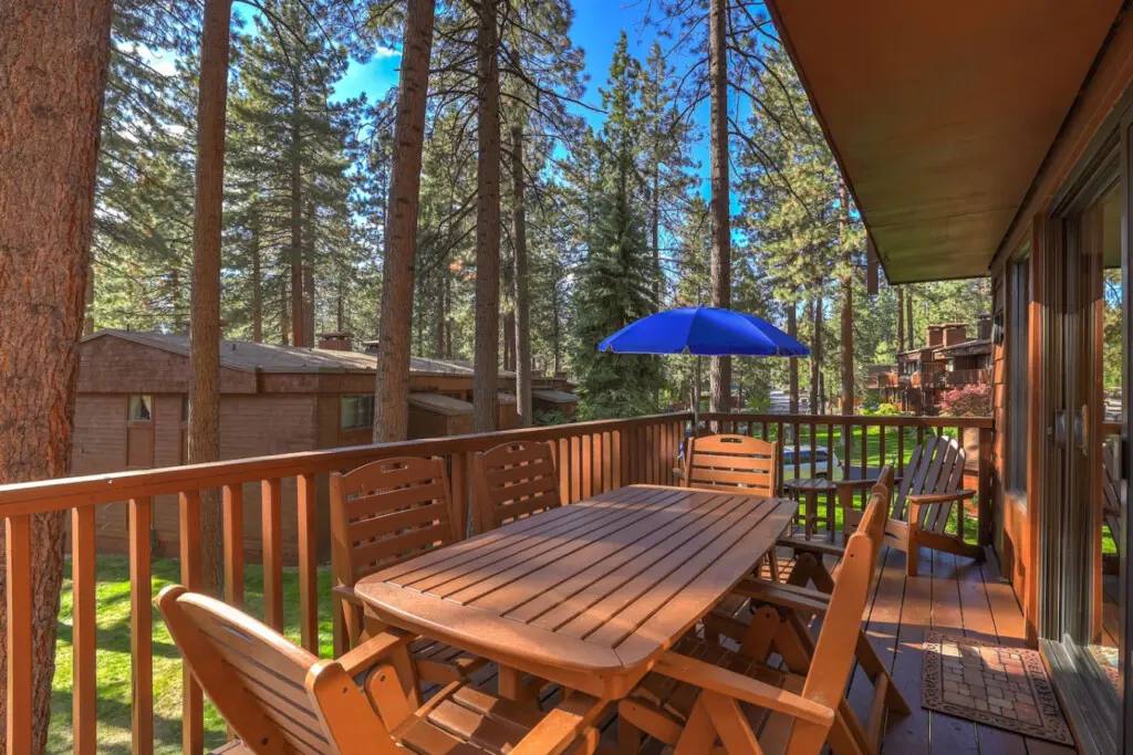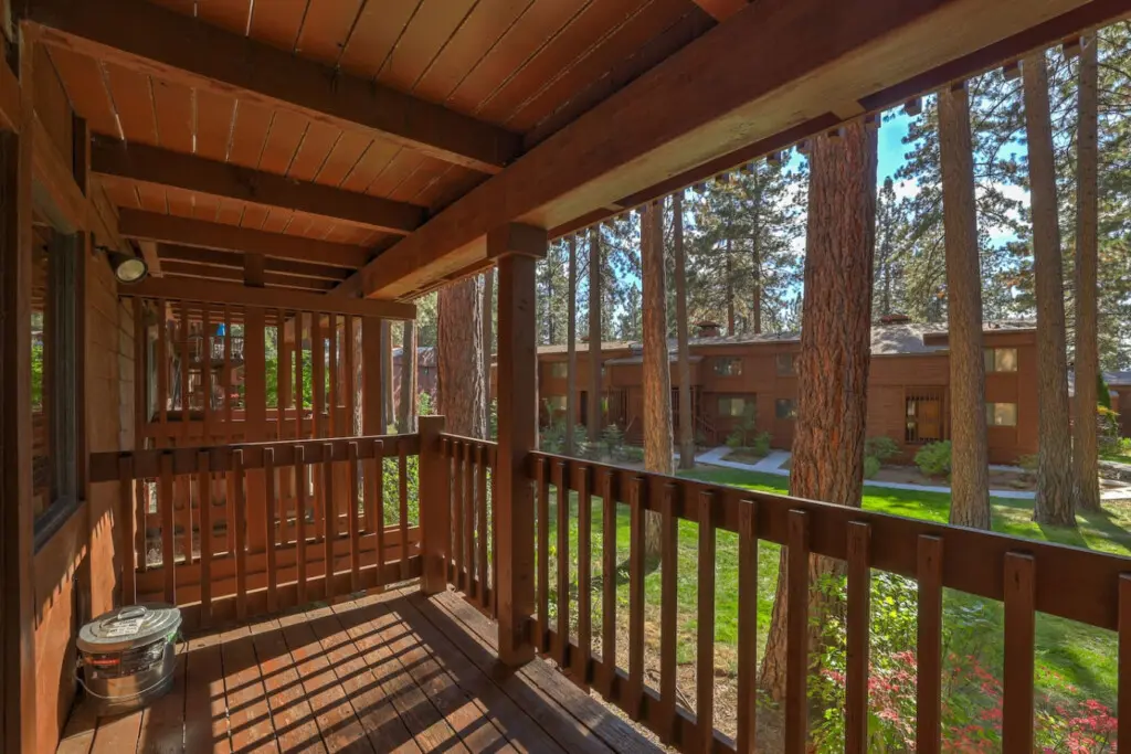 – Sliding glass doors lead to a furnished balcony with filtered views of Lake Tahoe.