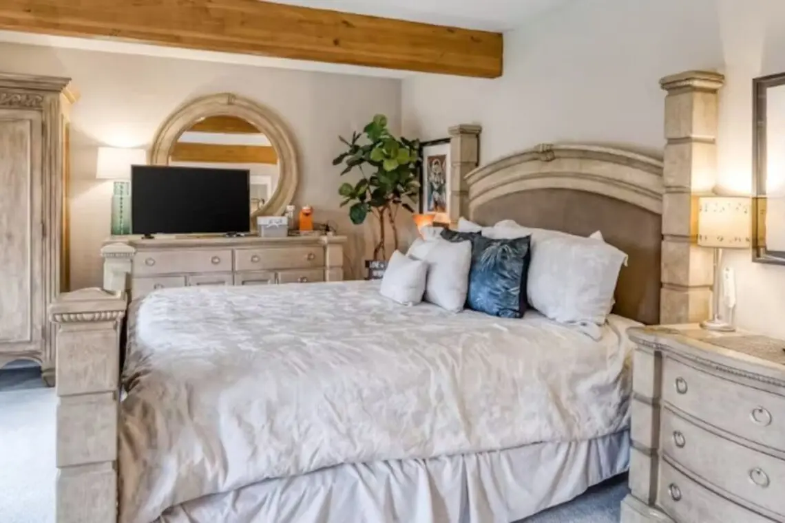– Queen bed with a large dresser and Smart TV discreetly placed in the cabinet.
