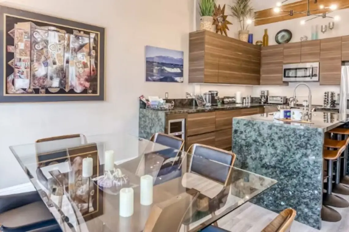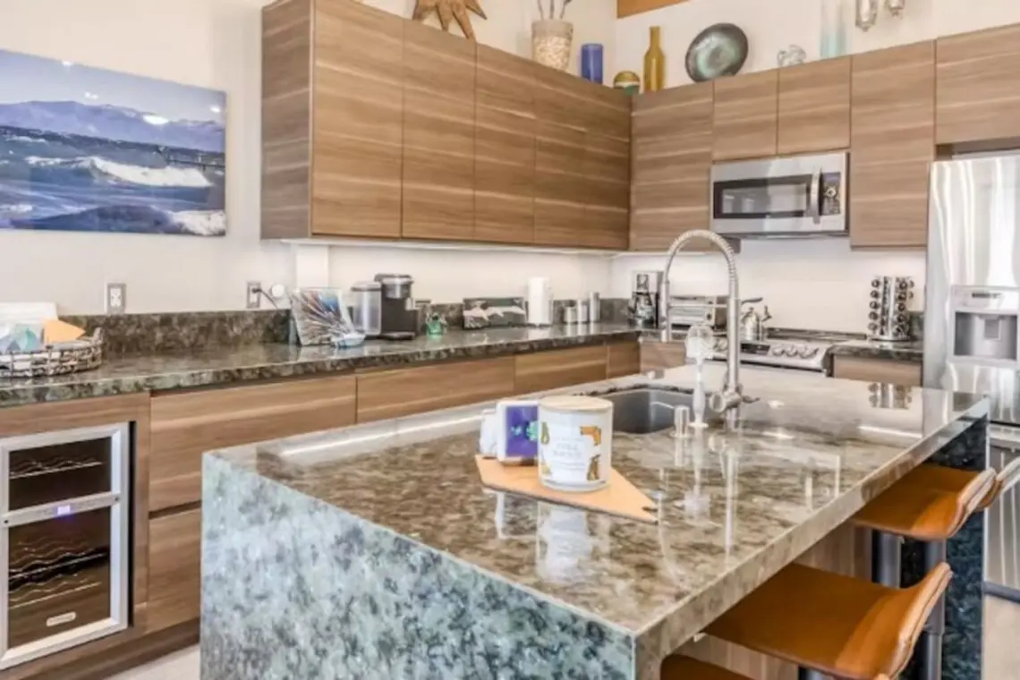 – Fully remodeled contemporary kitchen featuring stunning labradorite counters with a large island and granite sink.