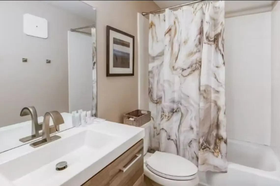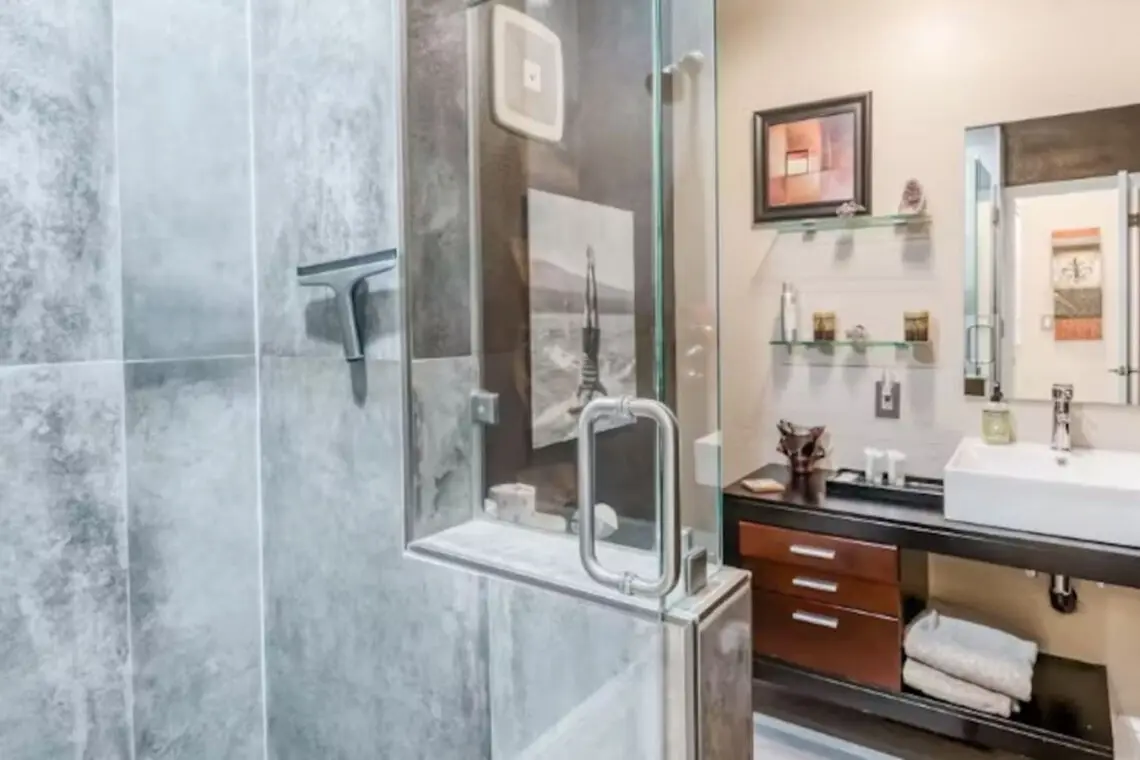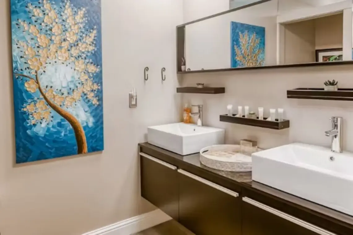 – Beautifully renovated vanity with twin sinks, oversized mirrors, and stylish lighting
