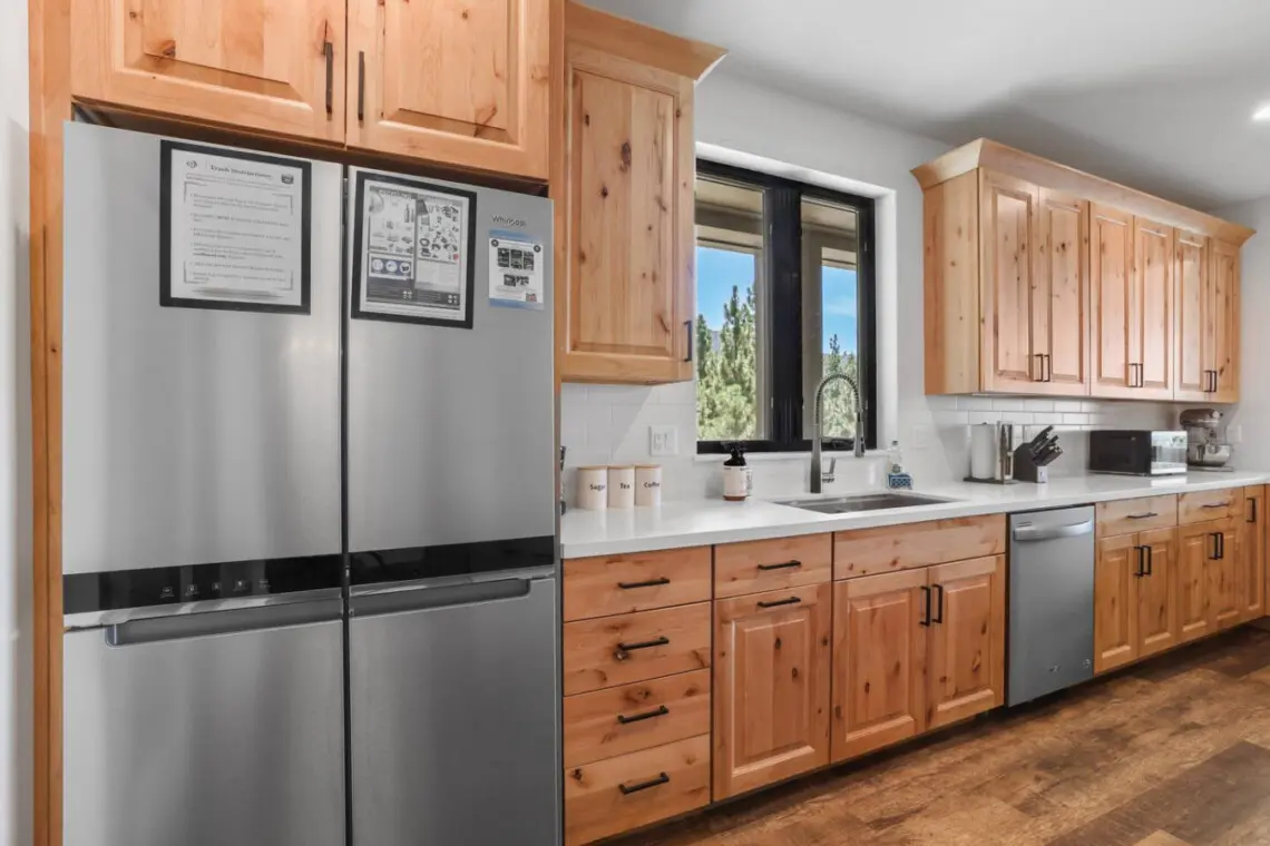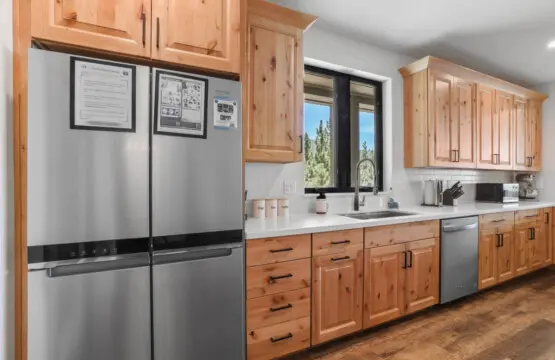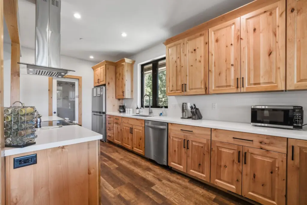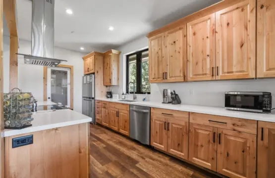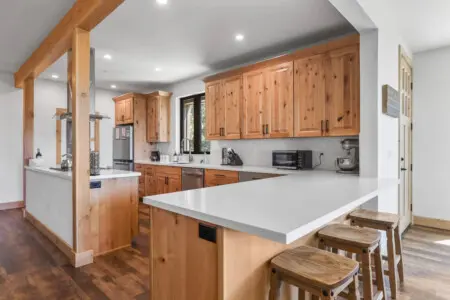 – Fully equipped kitchen that features beautiful wood cabinetry that adds a natural, earthy touch, perfectly complementing the sleek white countertops that provide ample prep space.