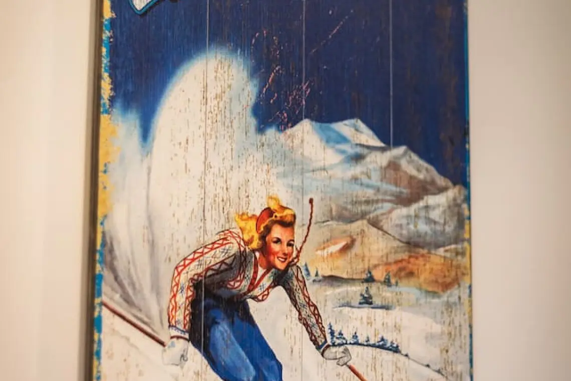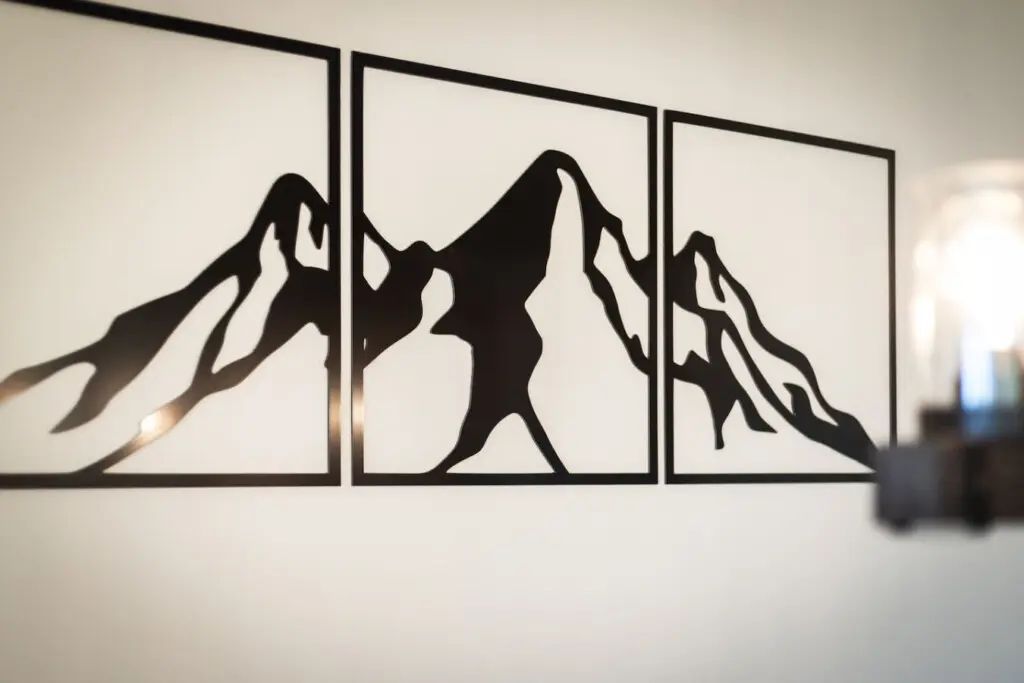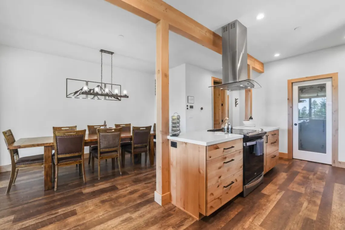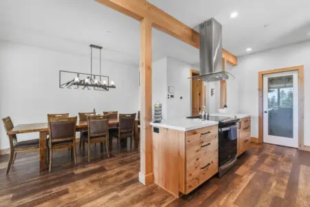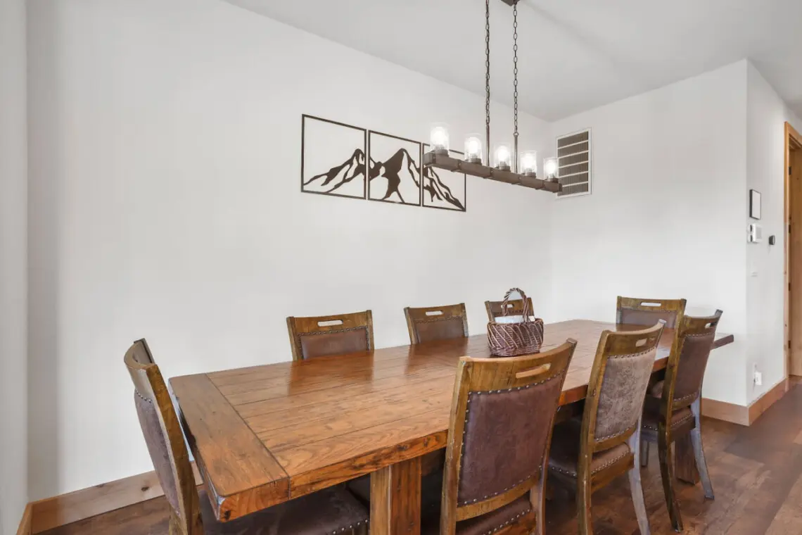 – Features a rustic wooden table and matching chairs, illuminated by a linear chandelier, with a minimalist mountain artwork on the white wall, creating a cozy and stylish ambiance.
