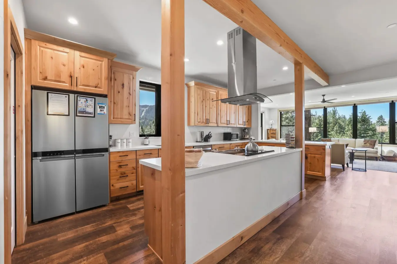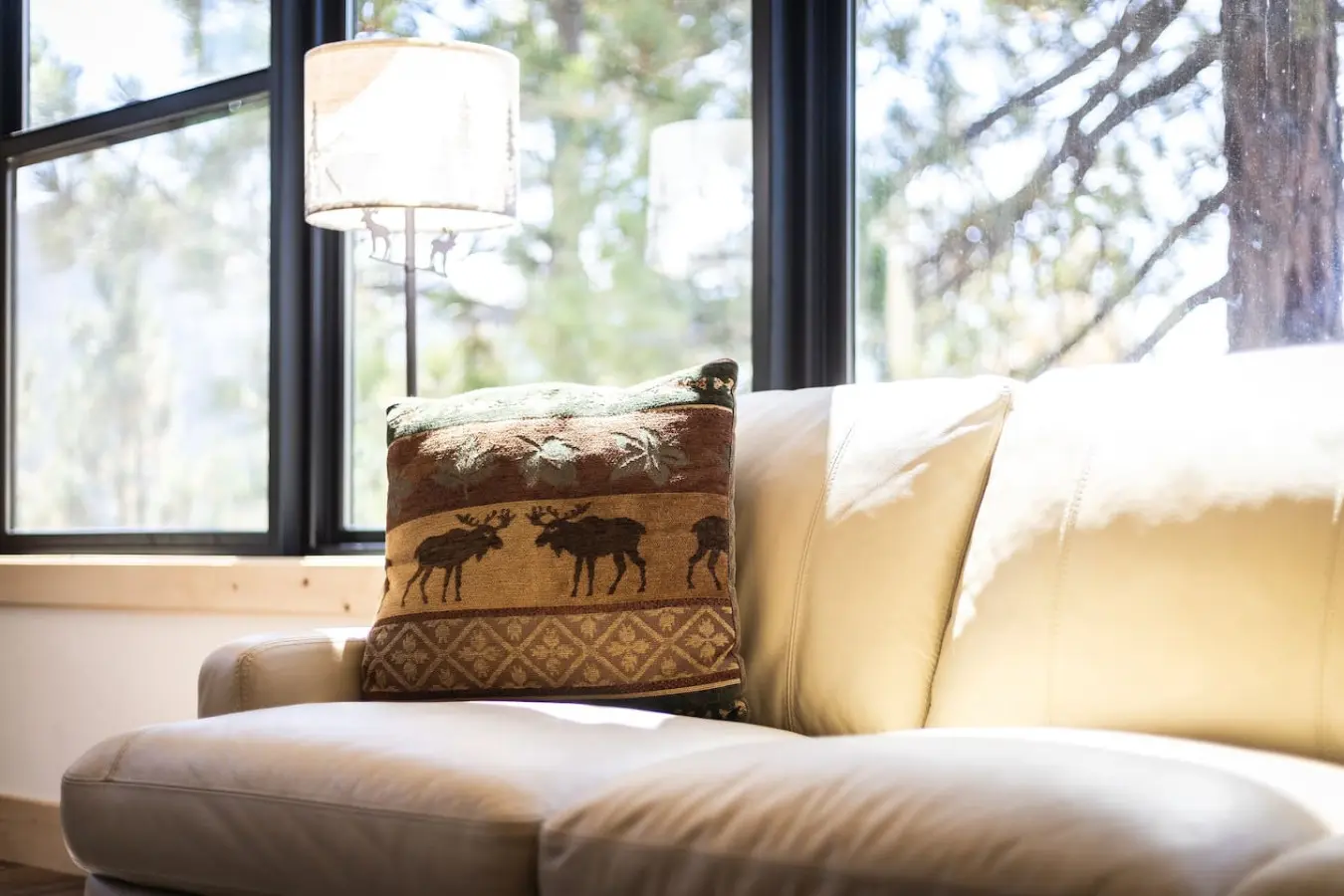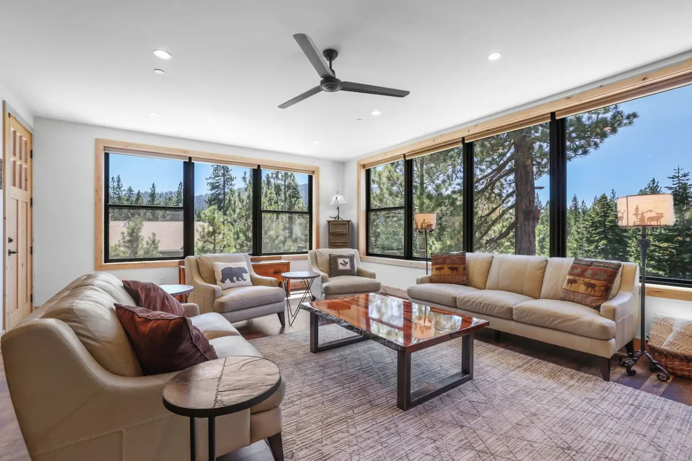 – A spacious living room that features floor-to-ceiling windows, offering stunning forest views