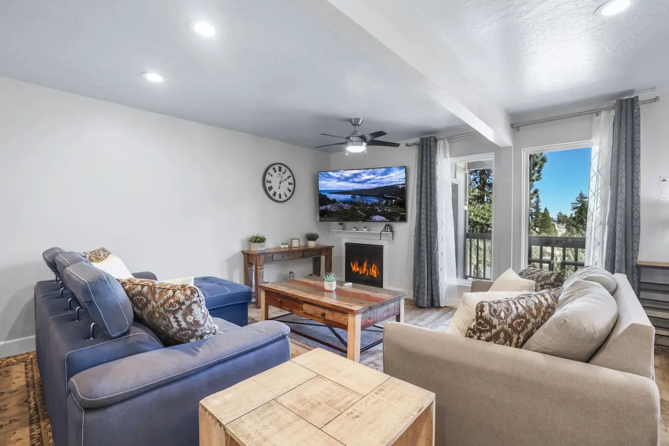 - Plush seating arranged around a gas fireplace, controlled by the thermostat just above, creates a warm and inviting gathering spot after a day of Tahoe adventures.